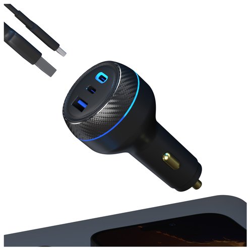 130W Car Charger: (i) 2X USB-C ports: 100W PD output; (ii) 1X USB-A port: 30W output. Blue charge ring indicator. Max output: 130W. Charges Laptops, Smartphones, Tablets & other mobile devices.