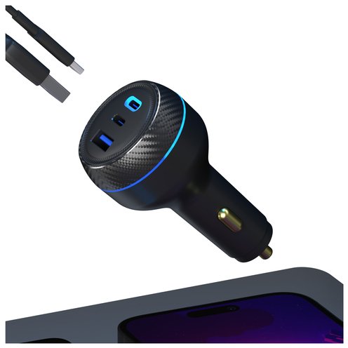 165W Car Charger: (i) 2X USB-C ports: 140W PD output; (ii) 1X USB-A port: 30W output. Blue charge ring indicator. Max output: 165W. Charges Laptops, Smartphones, Tablets & other mobile devices.
