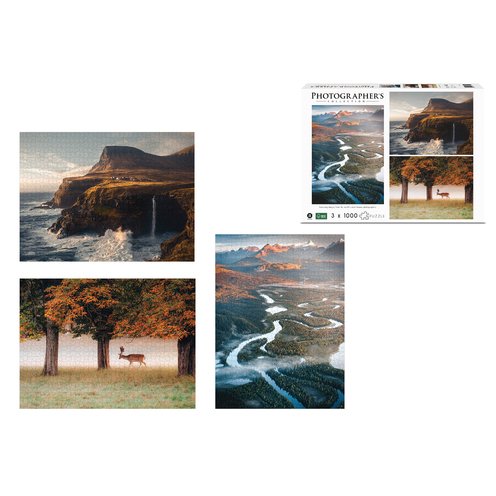Everyone wants a beautiful & memorable image on the puzzles they spend hours assembling. The Photographer's Collection is a new line of puzzles centered on featuring the images of popular modern photographers, mainly from Instagram. The featured photographers all have massive followings due to their compelling & stunning images. Now you can enjoy these images in puzzle form! This tri-pack set includes 3 famous images from the photographer, each in 1000pc format and measuring 20" x 27" (51cm x 69cm). The puzzles are made from high quality, FSC-certified environmentally friendly cardboard materials, as well as soy-based inks. One puzzle showcases a sunrise above remote parts of Swedish Lapland taken from a helicopter. Another is of a sunset on the coasts of Faroe Islands, Gasadalur. The third puzzle shows a deer on the rural fields of Eskilstuna, Sweden.