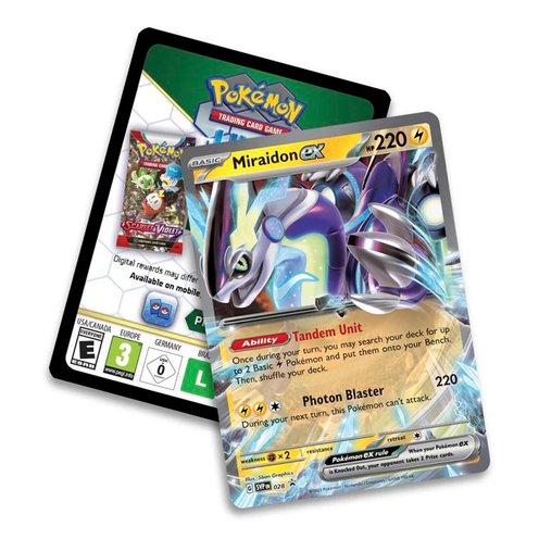 Traverse the hills, waters, and sky of the Paldea region with a Legendary Pokémon by your side! Choose the polished fortitude of Miraidon ex, boasting a useful Ability and strong attack, and then build up your collection with even more Pokémon and Trainer cards inside a handful of booster packs.