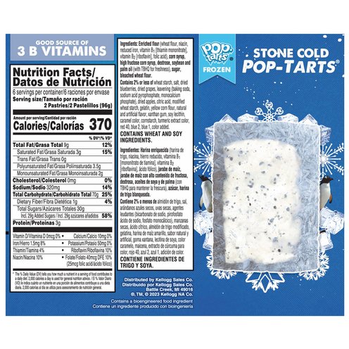Naturally & artificially flavored. Per 2 Pastries: 370 calories; 3 g sat fat (15% DV); 320 mg sodium (14% DV); 30 g total sugars. Good source of 3 B vitamins. Contains a bioengineered food ingredient. Stone cold Pop-Tarts. Some people never toast 'em (unless you count freezer burn). Fully baked & ready to eat! Or heat. Or freeze. Or stack. Certified 100% recycled paperboard. RSPO - Certified sustainable palm oil - Mixed. Proudly baked in the USA.
