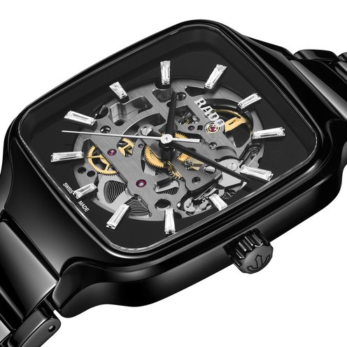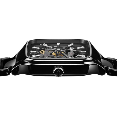 The Rado True Square Skeleton is a bold expression of modern luxury, where technical mastery meets refined elegance. At its core, the Rado calibre R808 automatic movement delivers 80 hours of power reserve, protected by an antimagnetic Nivachron™ hairspring tested in five positions for precision and reliability. Its monobloc polished black high-tech ceramic case and bracelet offer a smooth, enduring comfort, while the flat sapphire crystal with anti-reflective coating ensures perfect visibility. The black lacquered skeleton dial is elevated by trapezoidal diamonds, their exclusive sparkle adding depth and richness to the design. Black lacquered hands and a rhodium-coloured seconds hand glide gracefully across the dial, while the openwork movement reveals the watch's inner life, creating a deep emotional connection with the wearer. Water resistant to 50 meters, the True Square Skeleton is a perfect blend of brilliance, innovation, and timeless character.