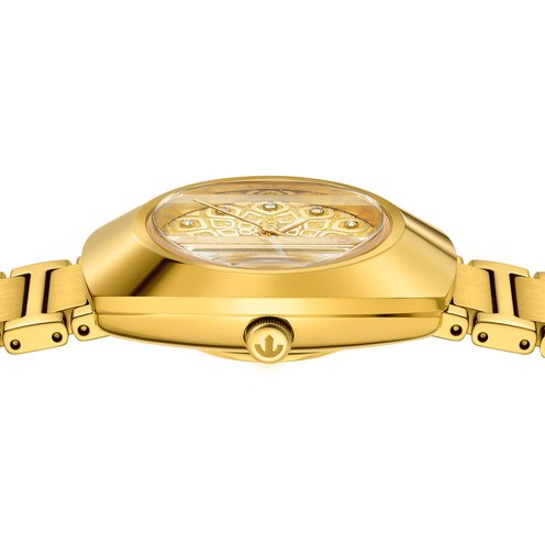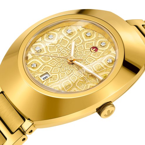 The Rado DiaStar Original returns in a refined new size, offering the same legendary design in a more compact and elegant form. Powered by the Rado calibre R586 automatic movement, it delivers 48 hours of power reserve, with reliability enhanced by an antimagnetic Nivachron™ hairspring tested in five positions. Its polished yellow gold PVD-coated Ceramos™ bezel ensures a lightweight feel, exceptional scratch resistance, and a golden brilliance that elevates the design. The vertically faceted sapphire crystal - a hallmark of the DiaStar - protects the intricate yellow dial, decorated with a harmonic pattern and diamond powder effect that shimmers with depth and texture. Eleven cubic zirconia stones serve as sparkling hour markers, while the iconic moving anchor symbol turns gracefully against a red background. Measuring 30 mm, this new DiaStar Original perfectly balances heritage and modernity, carrying forward the spirit of the 1962 original in a contemporary, wearable size.