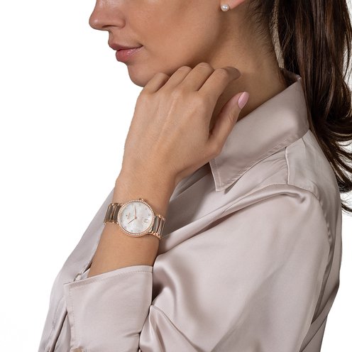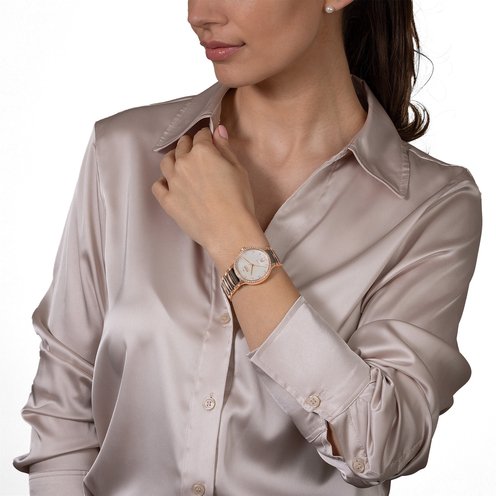 The Rado Centrix M Superjubile captures timeless elegance with a luminous play of light, blending refined craftsmanship with luxurious details. At its heart, the Rado calibre R763 automatic movement ensures flawless reliability, offering an impressive 80-hour power reserve supported by an antimagnetic Nivachron™ hairspring tested in five positions. Its polished rose gold PVD-coated stainless steel case is crowned by a bezel set with 60 brilliant Top Wesselton diamonds - one for every minute, symbolizing endless sparkle. The light silver mother-of-pearl dial glows with iridescent depth, adorned with eleven additional diamonds as hour markers, combining radiance with sophistication. Rose gold accents add warmth, while the bracelet pairs PVD-coated stainless steel with polished plasma high-tech ceramic links, ensuring lasting comfort and durability. Water resistant to 50 meters, the Centrix M Superjubile is a shining expression of Rado's mastery of materials, a watch designed to dazzle in every moment.
