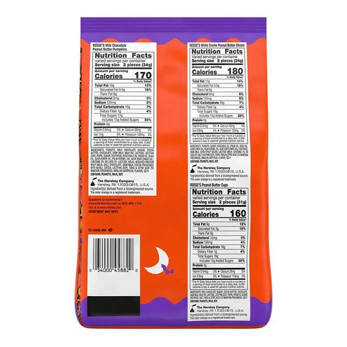 - Includes Reese's Peanut Butter Cups, Reese's Peanut Butter Pumpkins, Reese's White Ghost, and Reese's Pieces