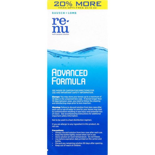 When used daily, Renu advanced formula cleans and helps prevent the formation of deposits on lenses. Always consult your eye care professional prior to switching to any other multi-purpose solution or if you have questions about your eyes. Triple Disinfectant System: Unique formula leverages 3 disinfectants to provide excellent disinfection. Excellent Cleaning: When used daily, Renu advanced formula multi-purpose solution cleans & helps prevent the formation of deposits on lenses. All Day Comfort: Conditions and hydrates lenses for all day comfort. 100% satisfaction guaranteed.