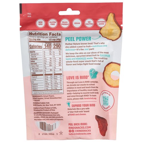 Bosc pear, red apple, sweet strawberry. 140 Calories per serving. 5 g Fiber per serving. Gluten free. Paleo friendly. Vegan. No sulfites. Non-GMO Project verified. nongmoproject.org. Nothing added. Ring - Keep it real. Eat the peel. Nothing added. Peel Power. Mother nature knows best! That's why she added a peel to fruit-nutritious and delicious-it's the zest part! We keep the skin on out slices of the most delicious, upcycled dried fruit to maximize taste and minimize waste. The result is a whole-food superfruit snack that's full of flavor and helps fight food waste! Love is Rind: Through our Love is Rind campaign, we donate nutritious snacks to school children in need and teach them the importance of healthy snack habits early - helping to nourish both body and mind through Rind! Expand Your Rind: Entertain like a pro with a char-fruit-erie board of Rind and cheese. Apples & pears product of USA, strawberries product of Turkey.