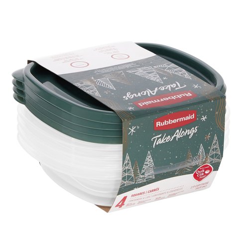 Add some extra cheery style and fun to holiday food storage! Rubbermaid TakeAlongs with festive blue spruce lids fit in perfectly with holiday decor and add a special touch to cookies and other sweet gifts. Perfect for all your seasonal plans, these square food storage containers with lids are all you need for worry-free food transportation to and from loved ones' homes while bringing back lots of delicious leftovers for yourself. The 2.9-cup container is ideal for storing and taking sides, like sweet potatoes or crispy Brussels sprouts, on the go. The Quik Clik Seal lids make an audible click when securely closed to seal in the freshness and avoid spills. Ridges on the lids add stability to stacking during travel and also save valuable space in the fridge and cabinets. This set includes four BPA-free lids and containers that are top-rack dishwasher-safe for easy cleaning; bases are microwave-safe for reheating. Enjoy a stress-free and delicious holiday season with TakeAlongs!