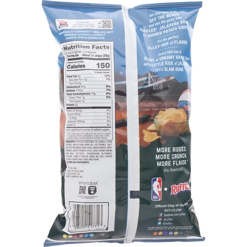 Ruffles have rrridges! Get your taste buds off the bench and into the game with Ruffles Jalapeno Ranch Flavored Potato Chips. It's the perfect alley-oop of flavor. Every bite has a blast of creamy ranch flavor and a little kick of jalapeno - it's a slam dunk. More ridges. More crunch. More flavor.