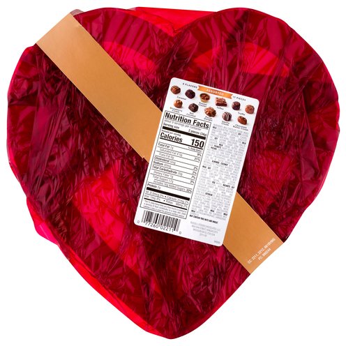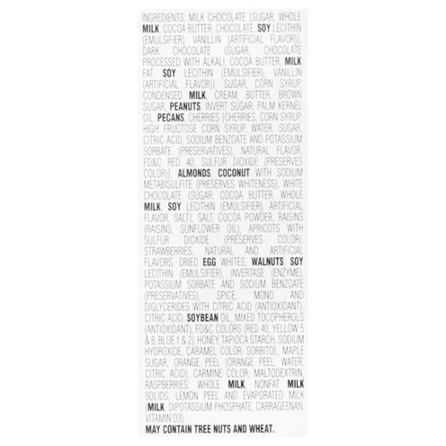 Ingredients: Milk Chocolate [Sugar, Whole Milk, Cocoa Butter, Chocolate, Soy Lecithin (Emulsifier), Vanillin (Artificial Flavor)], Dark Chocolate [Sugar, Chocolate Processed with Alkali, Cocoa Butter, Milk Fat, Soy Lecithin (Emulsifier), Vanillin (Artificial Flavor)], Sugar, Corn Syrup, Condensed Milk, Cream, Butter, Brown Sugar, Peanuts, Invert Sugar, Palm Kernel Oil, Pecans, Cherries (Cherries, Corn Syrup, High Fructose Corn Syrup, Water, Sugar, Citric Acid, Sodium Benzoate and Potassium Sorbate (Preservatives), Natural Flavor, FD&C Red 40, Sulfur Dioxide (Preserves Color), Almonds Coconut with Sodium Metabisulfite (Preserves Whiteness), White Chocolate (Sugar, Cocoa Butter, Whole Milk, Soy Lecithin (Emulsifier), Artificial Flavor, Salt), Salt, Cocoa Powder, Raisins (Raisin, Sunflower Oil), Apricots with Sulfur Dioxide (Preserves Color), Strawberries, Natural and Artificial Flavors, Dried Egg Whites, Walnuts, Soy Lecithin (Emulsifier), Invertase (Enzyme) Potassium Sorbate and Sodium Benzoate (Preservative), Spice, Mono and Diglycerides with Citric Acid (Antioxidant), Citric Acid Soybean Oil, Mixed Tocopherols (Antioxidant), FD&C Colors (Red 40, Yellow 5 & 6, Blue 1 & 2), Honey Tapioca Starch, Sodium Hydroxide, Caramel Color, Sorbitol, Maple Sugar, Orange Peel (Orange Peel, Water, Citric Acid), Carmine Color, Maltodextrin, Raspberries, Whole Milk, Nonfat Milk Solids, Lemon Peel and Evaporated Milk (Milk Dipotassium Phosphate, Carrageenan, Vitamin D3).
