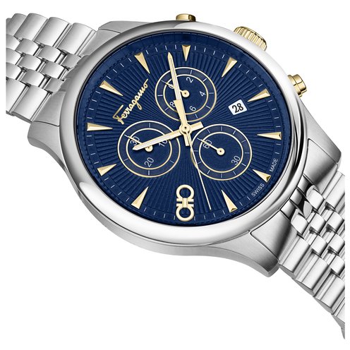 Ferragamo Duo Chrono is a great, classic timepiece re-proposed for this season in new color variations. The timepiece features a 42mm case, guilloch� dial with a chronograph complication and double Gancini symbol at 8 o'clock.