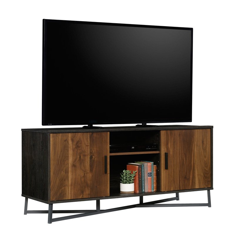 Gather your friends and pop some popcorn, it's time for a movie night around this TV credenza from the Canton Lane® collection. This credenza with sliding doors accommodates up to a 60" TV, making it a great spot for movie marathons or binge watching a new season of your favorite show. Display the best and hide the rest�this entertainment credenza features a sliding door for hidden storage and display. Easily hide your collection of books, board games, and organizing bins or display your favorite items like decorative plants and framed photos. This industrial TV stand includes three adjustable shelves that can move to different heights to store items of all shapes and sizes. The enclosed back panel includes cord access to keep wires neat and out of sight. Finished in Brew Oak™ with Grand Walnut® accents and a black powder-coated metal frame, this TV stand with storage is sure to catch the eye of all your guests.