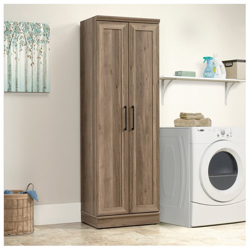 Have a home that looks clean and pristine with this storage cabinet from the HomePlus collection. Behind its framed panel doors, this narrow storage cabinet features four adjustable shelves to stow away all the kitchen clutter or mud room mess. The adjustable shelves allow for customizable storage options for tall cereal boxes or stacks of cans in the kitchen. It provides compact yet stylish space for binders, folders or board games in the office, or customizable storage for bottles of detergent and boxes of dryer sheets in the laundry room. Whether you need more storage in the pantry, basement, garage, or guest room, this tall storage cabinet with doors will look great no matter where you place it. Adjustable base levelers ensure that the two-door storage cabinet is level, even if the floor is not. Finished in beautiful and rustic Salt Oak® with framed panel doors, this stylish wood storage cabinet is the perfect storage and organization solution for any room in the home.