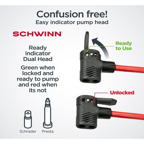 - MANUAL AIR PUMP: Keep your bike ready for the trails with the Schwinn Air Base Plus Foot Pump. The universal fit dual head works with both Schrader and Presta valves, and uses a red/green color indicator to show when you're ready to inflate