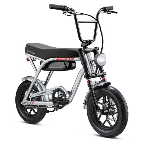 The Schwinn Hurricane is a compact e-bike that’s all about fast-moving fun. Make an impression as you zip by thanks to the stylish mag wheels and dual-crown fork. And you really will zip with the 250-watt motor’s top speed of 17.5 miles per hour. Race ahead by twisting the throttle, or let pedal assist kick in automatically if you feel like pedaling instead. You can venture comfortably onto gravel with the wide tires, and check your remaining battery life by glancing at the throttle display. Stopping and controlling your speed is easy with front and rear mechanical disc brakes, while built-in fenders shield you from road spray. Plus, enjoy nighttime visibility and all-day safety with the automatic LED lights. Ride the storm with the Hurricane compact e-bike. (Max range using pedal assist. Fully electric range using throttle may be less. Battery range and top speed can vary depending on rider height and weight, and riding conditions like hills or wind).