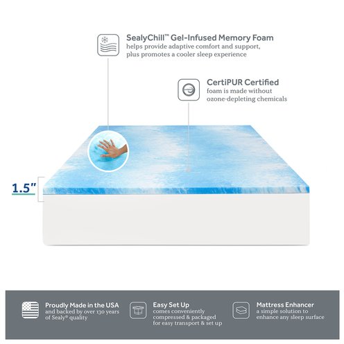 Sealy's® gel-infused memory foam mattress topper provide an even cooler way to upgrade any sleep surface - from dorm rooms and guest rooms, to worn down mattresses or sleep systems that simply need a refresh, these toppers give you the comfort boost you need, without splurging on a new mattress. Built with customer needs in mind, this collection offers solutions for all types of sleepers.
