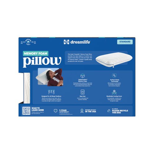 This Sealy Dreamlife Memory Foam Standard Size Bed Pillow provides the ideal balance of comfort and support every time you rest your head. And it's made by Sealy, a leader in quality sleep products for over 140 -Years. The advanced SealyComfort gel memory foam adapts and conforms to your unique shape to provide the ideal support for your neck and shoulders. Whether you sleep on your back, side or stomach, this adaptive pillow is designed to provide all-night comfort in any sleep position A breathable, cooling cover helps keep you comfortable through the night. The cover is also removeable and machine washable for easy care. Sealy Dreamlife is dedicated to promoting a healthier sleep environment. Surface-Guard Technology kills bacteria on the surface of the mattress, protecting it from common allergens. This pillow was designed and built and includes a 1-year limited warranty, so you can rest easy with comfort you can count on.