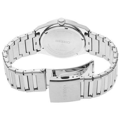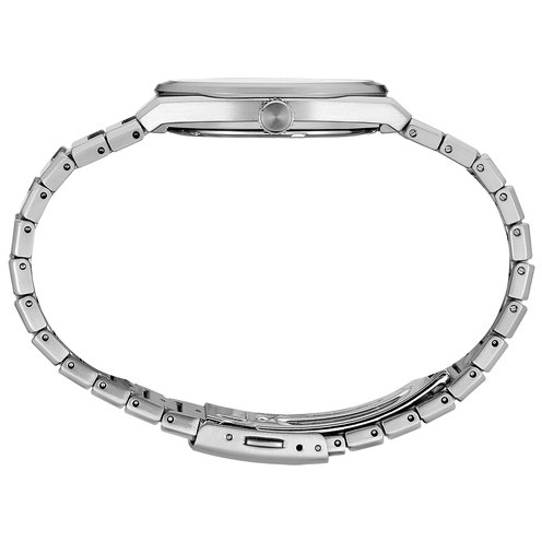 From the Essentials Collection. An updated classic, this sleekly angled watch features a silver pressed-pattern dial with simple stick indices, date calendar, and LumiBrite hands and markers. Crafted of stainless steel with a scratch-resistant sapphire crystal, this versatile timepiece includes a secure screwdown caseback and tri-fold push button release clasp. 10 bar, 100M Water Resistant
