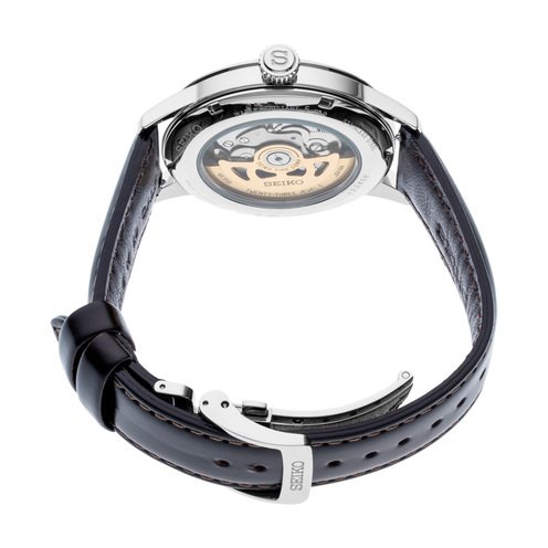 From the Presage Collection. Offering the finest in Japanese mechanical watchmaking, the Presage Collection blends precision technology with superior craftsmanship and design. Inspired by classic cocktails, this sophisticated design features a rich green dial with pressed pattern and gloss finish, gold second hand and date calendar. The screwdown see-through caseback provides a view of the 23-jewel movement, with manual and automatic winding capability, a frequency of 21,600 vibrations per hour, and a power reserve of approximately 41 hours. Crafted of stainless steel, this elegant timepiece includes a box-shaped crystal, brown leather strap and tri-fold push button release clasp. 5 bar, 50M Water Resistant