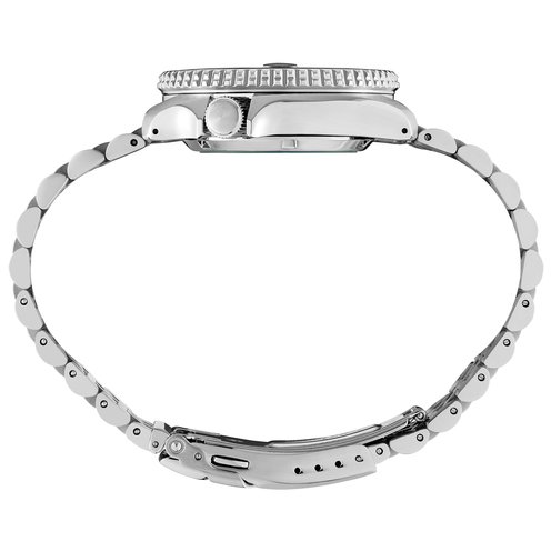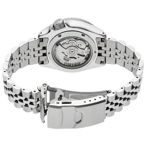 Seiko 5 Sports SKX Sports Style GMT Series. Adding new richness to classic sport/dress design, this dynamic watch offers a new variation on the popular "SKX" style. Equipped with automatic technology that you control with every movement, this versatile watch is powered by a 24-jewel movement that beats at a frequency of 21,600 vibrations per hour, with a power reserve of approximately 41 hours and manual winding capability. The silver dial features bold luminous hands and markers and a magnified date calendar, as well as a large blue GMT hand for instant visibility and is framed by a dramatic dual-tone blue and black GMT bezel. A stylized five-row stainless steel bracelet, with tri-fold push button release clasp and lock, adds rich texture and wearability, while the stainless steel case includes a screwdown see-through caseback for a view of classic timekeeping in action. 10 bar, 100M Water Resistant