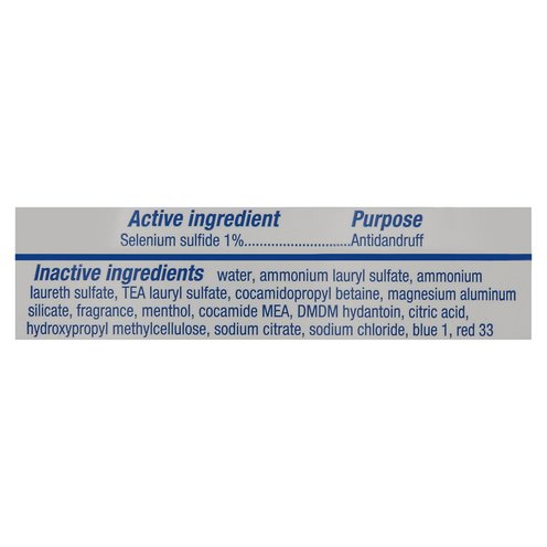 Selenium sulfide 1%. Cooling menthol refreshes and soothes scalp. Helps prevent and eliminate itchy scalp & visible flakes (flakes and itch associated with dandruff). Tough on dandruff.