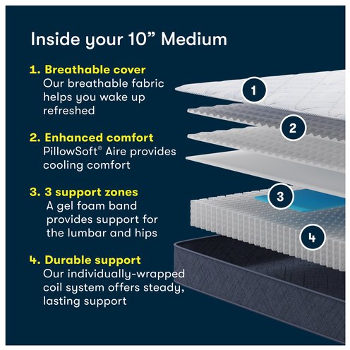 The Serta® Five Star Mattress® 10" Medium delivers comfort and convenience. Our mattress in a box fully expands quickly so you can sleep on it right away. This quilted innerspring mattress features our individually-wrapped coil system for durability and all-night support. Pillowsoft® Aire Foam offers airflow and enhanced cushioning for exceptional comfort. Plus, Serta® Pillowsoft® Foam provides gentle contouring support. Looking for lower back care? A gel foam band provides our signature zoned comfort for the lumbar and hips. A breathable fabric cover helps you to rest well and wake up refreshed. The Serta® Five Star Mattress® - from box to bed in seconds™.