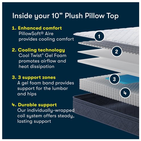 The Serta® Five Star Mattress® 10" Plush Pillow Top delivers comfort and convenience. Our mattress in a box fully expands quickly so you can sleep on it right away. This quilted innerspring mattress features our individually-wrapped coil system for durability and all-night support. Pillowsoft® Aire Foam offers airflow and enhanced cushioning for exceptional comfort. Plus, Serta® Pillowsoft® Foam provides gentle contouring support. Cool Twist® Gel Foam is designed to promote airflow and heat dissipation. Looking for lower back care? A gel foam band provides our signature zoned comfort for the lumbar and hips. A breathable fabric cover helps you to rest well and wake up refreshed. The Serta® Five Star Mattress® - from box to bed in seconds™