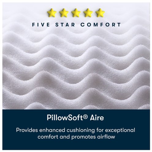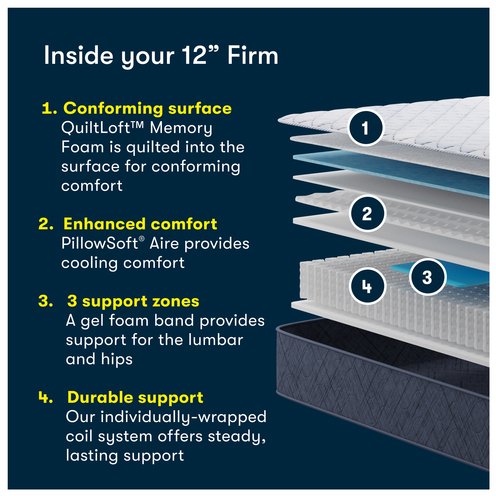 The Serta® Five Star Mattress® 12" Firm delivers comfort and convenience. Our mattress in a box fully expands quickly so you can sleep on it right away. This quilted innerspring mattress features our individually-wrapped coil system for durability and all-night support. Pillowsoft® Aire Foam offers airflow and enhanced cushioning for exceptional comfort. Plus, Serta® Pillowsoft® Foam provides gentle contouring support while QuiltLoft™ Memory Foam offers additional comfort at the surface of the mattress. Looking for lower back care? A gel foam band provides our signature zoned comfort for the lumbar and hips. A breathable fabric cover helps you to rest well and wake up refreshed while our antimicrobial technology keeps your mattress fresh and clean from odor-causing bacteria. The Serta® Five Star Mattress® - from box to bed in seconds™.