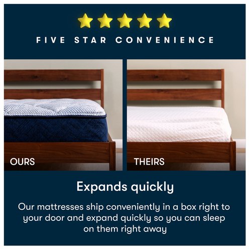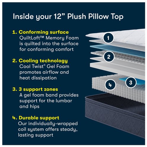 The Serta® Five Star Mattress® 12" Plush Pillow Top delivers comfort and convenience. Our mattress in a box fully expands quickly so you can sleep on it right away. This quilted innerspring mattress features our individually-wrapped coil system for durability and all-night support. Pillowsoft® Aire Foam offers airflow and enhanced cushioning for exceptional comfort. Plus, Serta® Pillowsoft® Foam provides gentle contouring support while QuiltLoft™ Memory Foam offers additional comfort at the surface of the mattress. Looking for lower back care? A gel foam band provides our signature zoned comfort for the lumbar and hips. Cool Twist® Gel Foam is designed to promote airflow and heat dissipation. A breathable fabric cover helps you to rest well and wake up refreshed while our antimicrobial technology keeps your mattress fresh and clean from odor-causing bacteria. The Serta® Five Star Mattress® - from box to bed in seconds™.