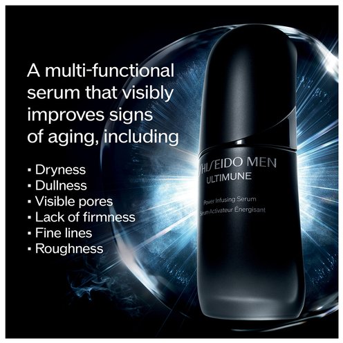 Multi-functional serum visibly improves multiple male skin aging concerns such as dryness, dullness, visible pores, lack of firmness and fine lines.