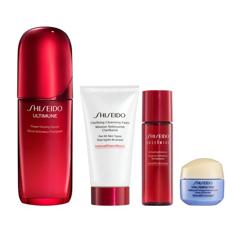 Help prevent and visibly correct signs of aging with this limited-edition gift set of advanced Shiseido skincare formulas, featuring a full-size Ultimune Power Infusing Serum. Whisk away impurities and makeup with Clarifying Cleansing Foam, visibly brighten and boost clarity with Eudermine Activating Essence, address signs of aging like uneven skin tone, dullness, and wrinkles with Ultimune Power Infusing Serum, and see firmer and brighter skin with Vital Perfection Uplifting and Firming Advanced Cream.