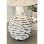 Shine a contemporary spotlight on your good taste with the Aleela lamp. The antiqued white and goldtone finish of this metal lamp add texture and interest to any space. With a modified drum shade, this light will illuminate your decor with style.