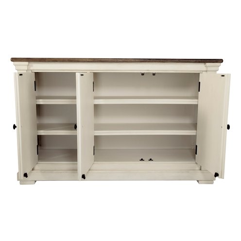 Need a stylish space to store dinnerware and all your dining room essentials? The Bolanburg server is a dream come true with four adjustable shelves that offer large capacity and a spacious top that's perfect for setting a buffet. Embellished with the casual appeal of three latticed doors, an attractive planked top with weathered oak finish and a lightly distressed white finish throughout, this vintage look will serve up elegance for years to come.
