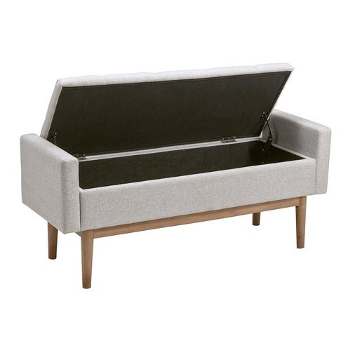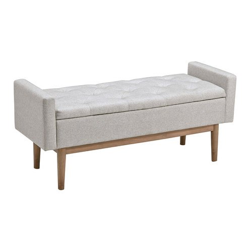 Style gets a practical upgrade with this bench. The tufted beige seat cushion is hinged to allow easy access to whatever you need to hide in plain sight.