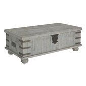 Unlock a quaint touch of farmhouse style and convenience in your living area with the Carynhurst lift top coffee table. Its design is inspired by the rugged looks of an antique storage trunk. Metal keyhole and bracket accents with rivets, a planked effect and large recessed bun feet dress up this charming piece. The distressed light gray finish enhances the wood's natural grain, which delivers a naturally aged feel. You’ll love its generous scale, offering a roomy top that's ideal for displaying accents and more. Lift the top and enjoy the accommodating work or dining surface. Under the lift top, there's a fully finished storage area—deeply spacious for organization.