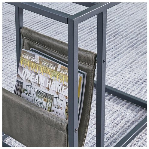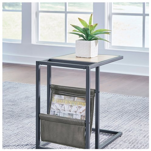Casual contemporary design with a clean silhouette. That's the beauty of this chairside end table. Quality crafted with elm veneer, its tabletop is finished in a light natural wood tone that lends a fresh, organic look. Cool metal C-frame in a matte black finish and a hanging magazine basket made with a durable brown faux leather coordinate beautifully with the less-is-more profile.