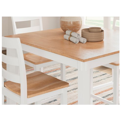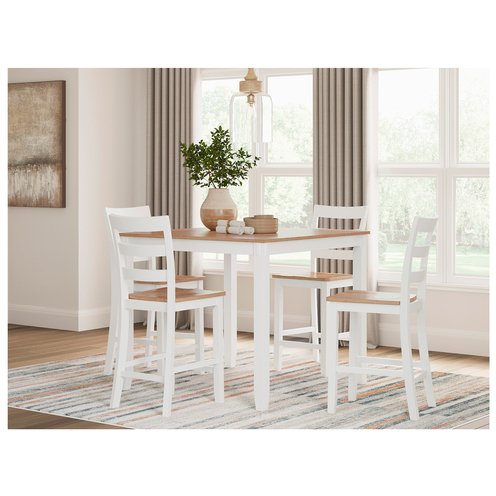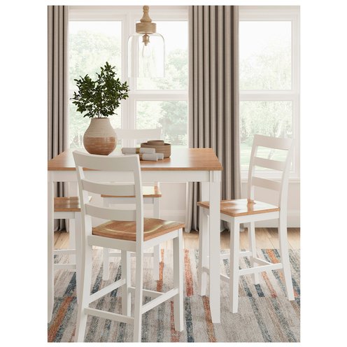 Who says a simple design can't be eye-catching? This counter height dining table with bar stools has a casually cool style, yet it still turns heads. The two-tone table and bar stools are effortlessly handsome. And the ladderback bar stools cater to your comfort with contoured seats. Aside from dining, this set's relaxed simplicity is perfect for homework, morning coffee or checking all those emails.