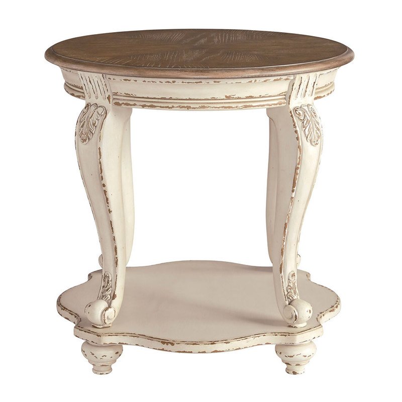 Traditional farmhouse design with an antiqued two-tone finish featuring chipped white with distressed wood finished tops.