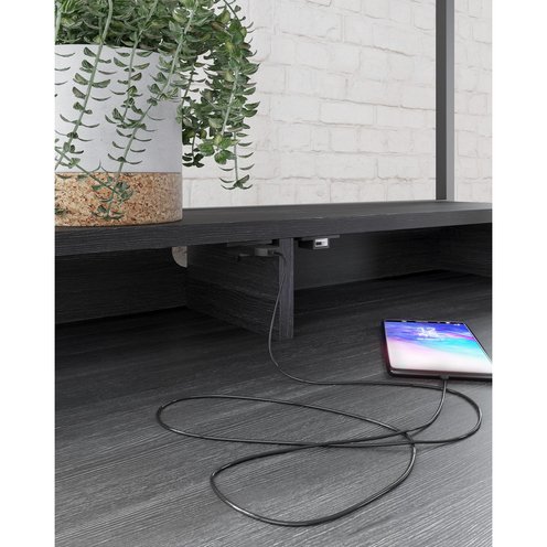 Elevate your home office with this simply sensational desk and shelf. Pairing a dark wood grain look with a black metal frame for modern appeal, the minimalistic desk provides a convenient work surface with incorporated cubby shelves (with cutout for wire management) and two upper shelves for extra storage and display space. Its open-concept design, sleek aesthetic and built-in charging ports help you make the most of small space living. Signature Design by Ashley® is a Registered Trademark of Ashley Furniture Industries, LLC.