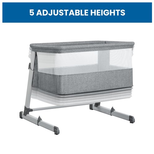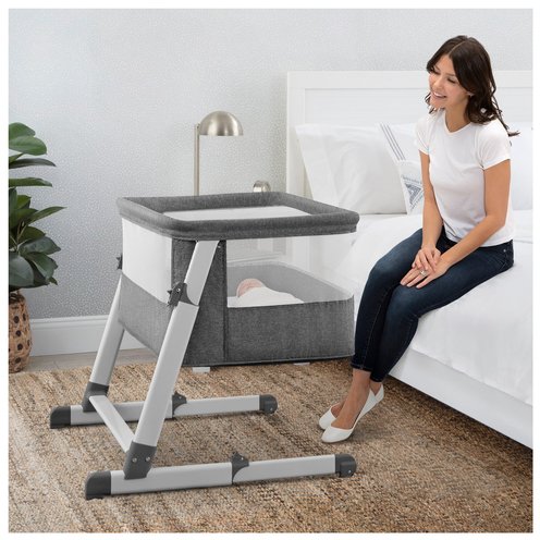 The Deluxe Bedside Bassinet by Simmons Kids makes it extremely easy and safe to room share with your little one. The bassinet’s modern z-shaped frame is outfitted with wheels, so you can easily slide the base under your bed to keep your baby nearby, while still giving them a safe, separate sleep space. Perfect for all mothers (especially those breast feeding or recovering from C-sections), this bassinet’s sturdy, adjustable height fits next to almost any bed, and keeps your baby at eye level, so you can easily soothe and tend to them during their first few months. Mesh sides provide a clear view and help increase airflow. The bedside sleeper of your dreams, the Simmons Deluxe Bedside Bassinet allows you to feel close and connected to your little one in the safest way possible. This bassinet holds up to 30 pounds and is recommended for babies 0-5 months. Stop use at 5 months or once your infant begins to push up on their hands and knees, whichever comes first.