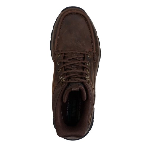 Tread through the elements in all-day comfort with Skechers Hands Free Slip-ins® Relaxed Fit®: Respected 2.0 - Hagler. This moc toe boot features a leather and synthetic upper with front laces, charcoal-infused Skechers Air-Cooled Memory Foam® insole, and an anti-slip Goodyear® Rubber Outsole.
