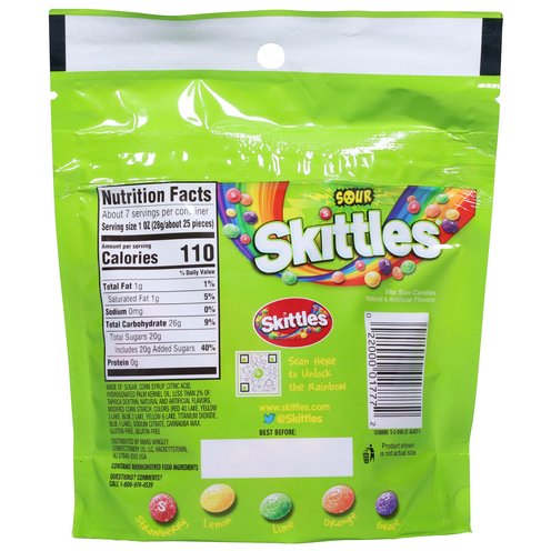 Made to celebrate the other side of sweet, Sour SKITTLES candy offers a tangy twist on our Original mix and includes sour strawberry, sour lime, sour lemon, sour orange and sour grape flavors.