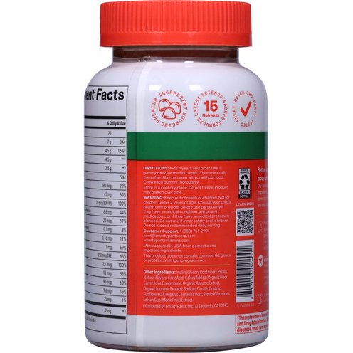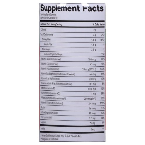 Multivitamin to support growing bodies with 15 daily nutrients including vitamins C, D3, B12, A, E, K1, and folate, as well as prebiotic fiber for kids digestive health.