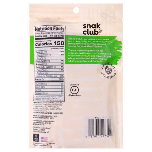 Peanuts, roasted edamame, dried cranberries, pumpkin seeds, almonds & cashews. No artificial colors or flavors. 8 g protein. Certified gluten-free. Good source of fiber. See nutrition information for total fat content. New look same great taste. No preservatives. At Snak Club, we believe if you snack great, you feel great. That's why we've been perfecting only the greatest snacks for more than 35 years. There's something delicious for everyone within our creatively crafted assortment of nuts and mixes. So grab a bag, and discover what happens when you go beyond the trail. Nothing but greatness. Tear, snak, reseal. Packaged in the USA.