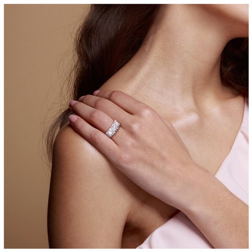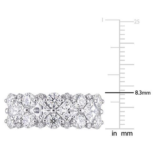 This shimmering multi-cut moissanite and diamond anniversary ring from the Moissanite is crafted in lustrous 10-karat white gold and features 14 princess and round-cut, prong-set created moissanite gemstones with eight round-cut, prong-set glistening diamonds in a unique clustered semi-eternity design. Whether worn as an anniversary band or simply an exquisite new piece, this ring is sure to make a standout addition to any jewelry collection. Choose this outstanding moissanite and diamond ring either for yourself or someone you love.