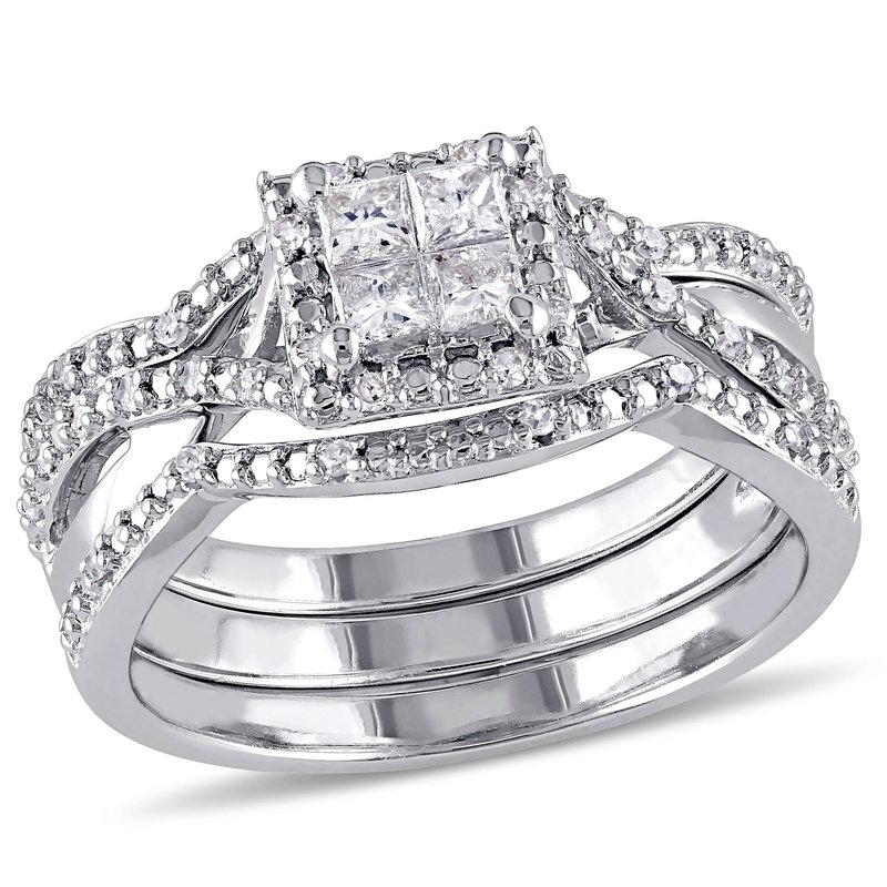 This wondrous bridal ring set features a gorgeous engagement ring with princess-cut white diamond center stones and round white diamond side stones. This timeless set is complemented with two matching diamond studded wedding bands. Both rings are finely crafted of gleaming sterling silver and are enhanced with a high polish finish.