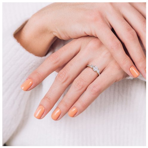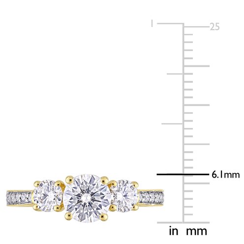 This shimmering three-stone engagement ring is a beautiful gift for your special someone. Crafted in lustrous 10-karat gold, this gorgeous wedding ring features 3 round-cut, glittering created white moissanite gemstones at the center of the ring in a trinity pattern giving the ring a timeline. 12 round-cut, prong-set created white moissanite gemstones decorate the band of the ring showering splendor. This unique bridal ring will seamlessly blend with her unique style. A perfect addition to any jewelry collection.