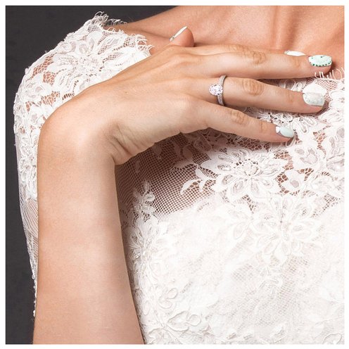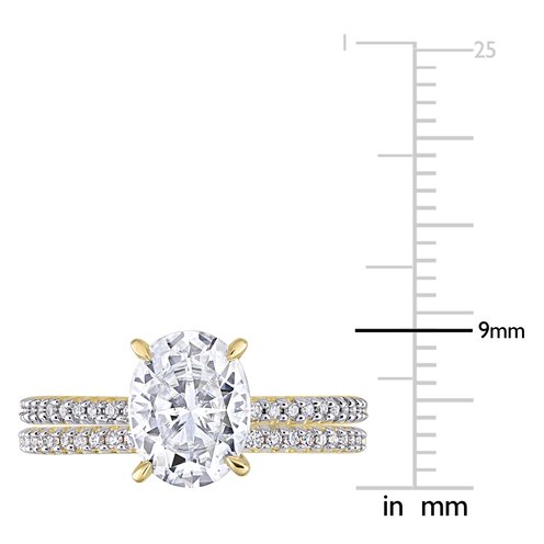 This unique and sophisticated moissanite bridal ring set is crafted in 14-karat yellow gold and features an oval-cut, prong-set created white moissanite at the center with 47 round-cut, buttercup-set glistening diamonds in a stunning solitaire bridal design. With exquisite luster and incredible shine, choose this bridal set for your bride-to-be as you celebrate this special milestone and begin the next stage of your lives together.