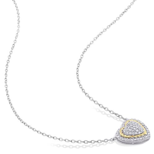 This dazzling cluster halo heart necklace is crafted in two-tone plated sterling silver. This lovely halo pendant features round-cut, pave-set diamonds clustered together in a heart motif. Enhanced with a high polish finish, this pretty necklace is suspended on a 17-inch cable chain and is secured with a spring ring clasp. Pair this trendsetting and timeless necklace with any ensemble and look stunning. A perfect addition to any jewelry collection.