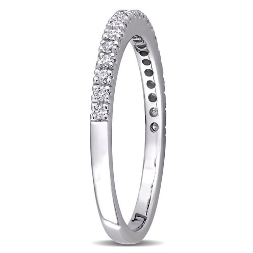 This classic moissanite stackable wedding band is crafted in lustrous 10-karat white gold and features 20 round-cut, prong-set created moissanite gemstones in a traditional semi-eternity band design. Whether worn as a wedding band, anniversary band or simply a gorgeous stackable piece, this gemstone ring is sure to make a perfect elegant addition to any jewelry collection.
